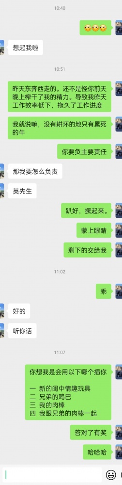 经过第五天完全冷落的一天。骚姑娘自己的尺度明显变大了,无障碍的聊到三人行。不会再有恼怒情绪的感觉